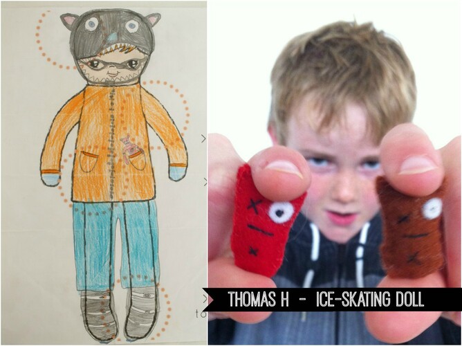 I like things to do with snow and ice. And, I like mini monsters. I wanted my doll to have both these things. It is my first doll design. I drew it straight away. I especially wanted one of my mini monsters in it. I named him Tom. I want Tom to look a bit like a monster when he puts his helmet on. He can carry the mini monster in his pocket. Skis might be a bit tricky, so Tom has ice skates on his feet.