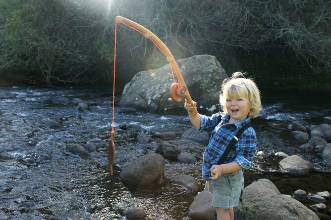 Awhile ago a friend suggested that JR add a fishing rod to his wooden toy range. I imagined a dowel with a handle, but in true JR style this is what he comes out of the workshop with. I mean, of course a rod should be bent - kids will be catching monstrous fish with them won't they?